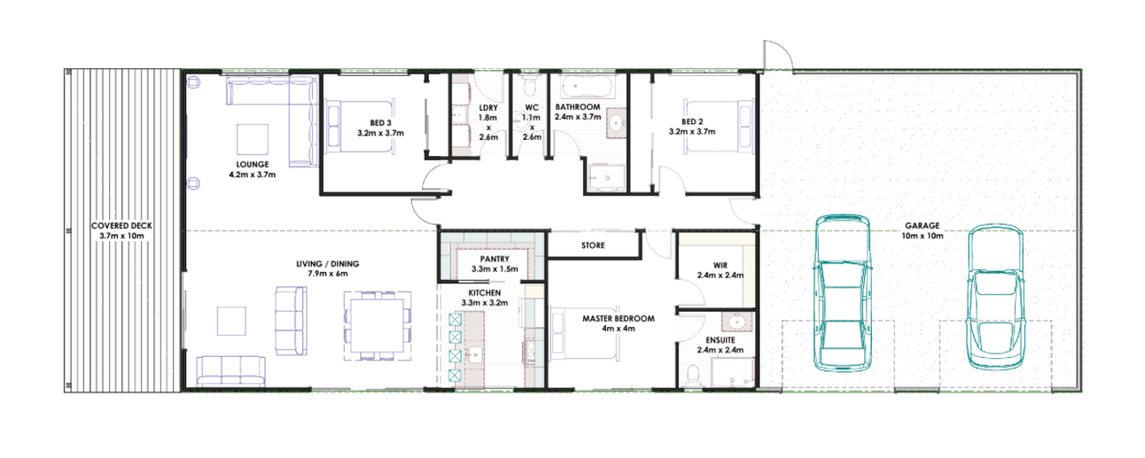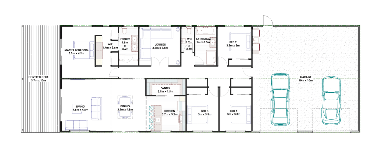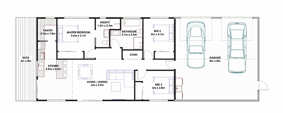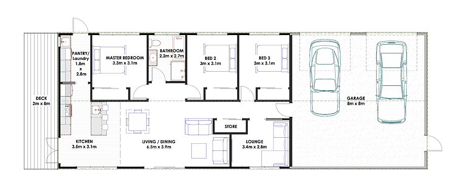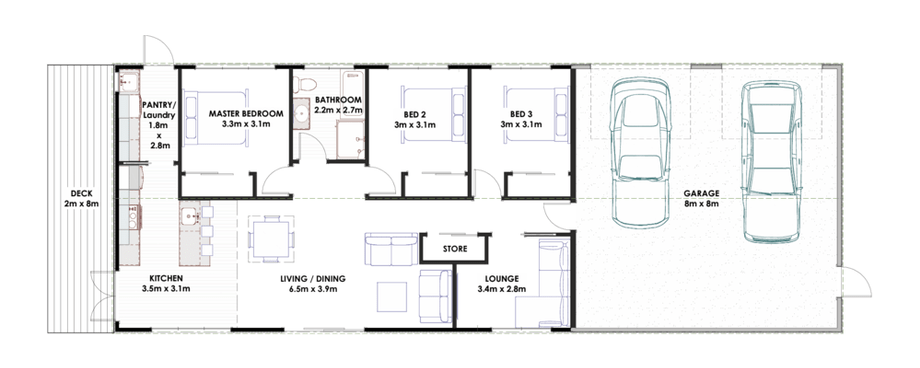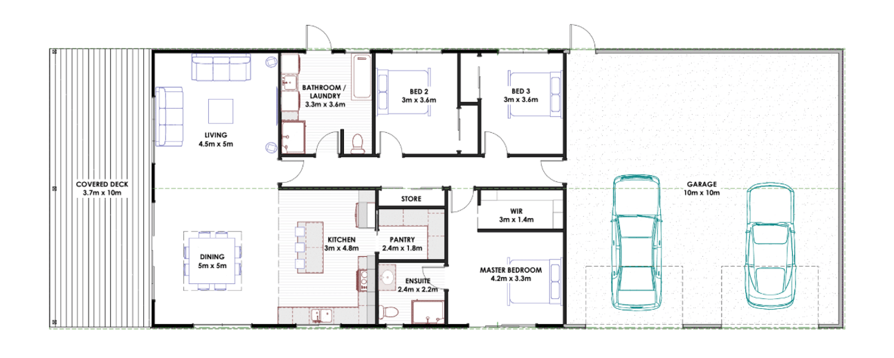 The Pearson Build is part of our all-purpose shed homes range. It offers three spacious bedrooms, with a unique bathroom/laundry combo that allows direct access from outside—ideal for rural living. The home is complemented by a full kitchen, expansive indoor-outdoor flow via a covered deck, and a huge garage, providing a practical and comfortable lifestyle that’s built to last.