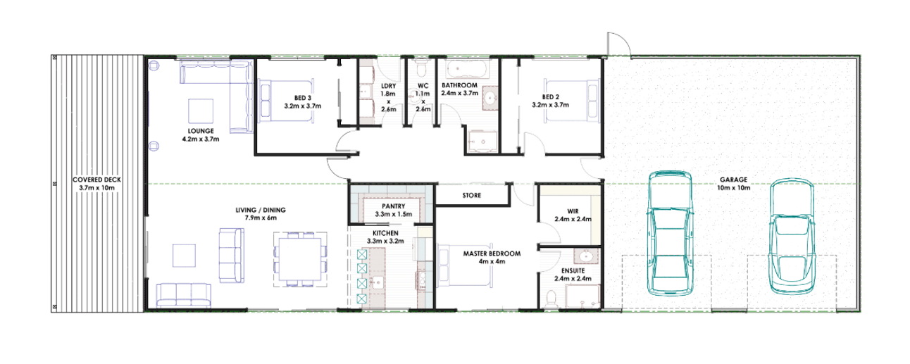 The Brunner Build is the go-to choice when space and separation matter. With four bedrooms and two living areas, it’s built to handle the needs of a busy household. The main lounge is tucked away from the bedrooms for added privacy, while the open-plan living and master bedroom both open onto a covered Kwila deck—perfect for soaking in the views.