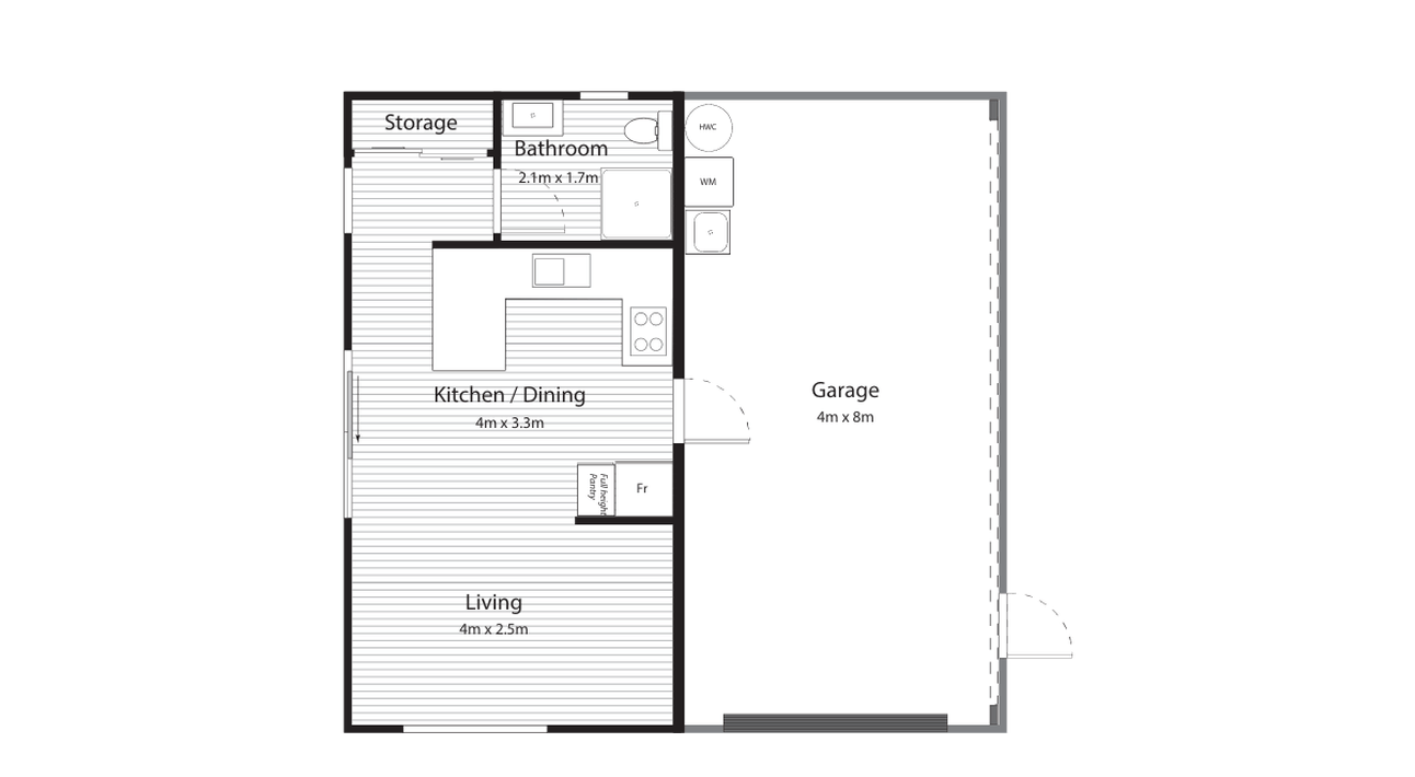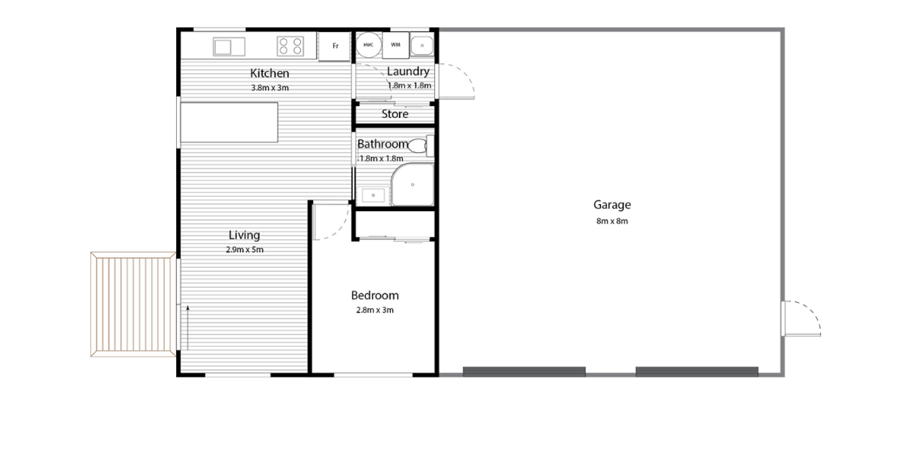 The Twizel Build offers all the conveniences of a full kitchen, bathroom, laundry, and one double bedroom with a built-in wardrobe, all within a modest budget. It's a great option for a bach, providing a central hub for all the family with an overflow garage for bunks, boats, a pool table, a chest freezer, and more.