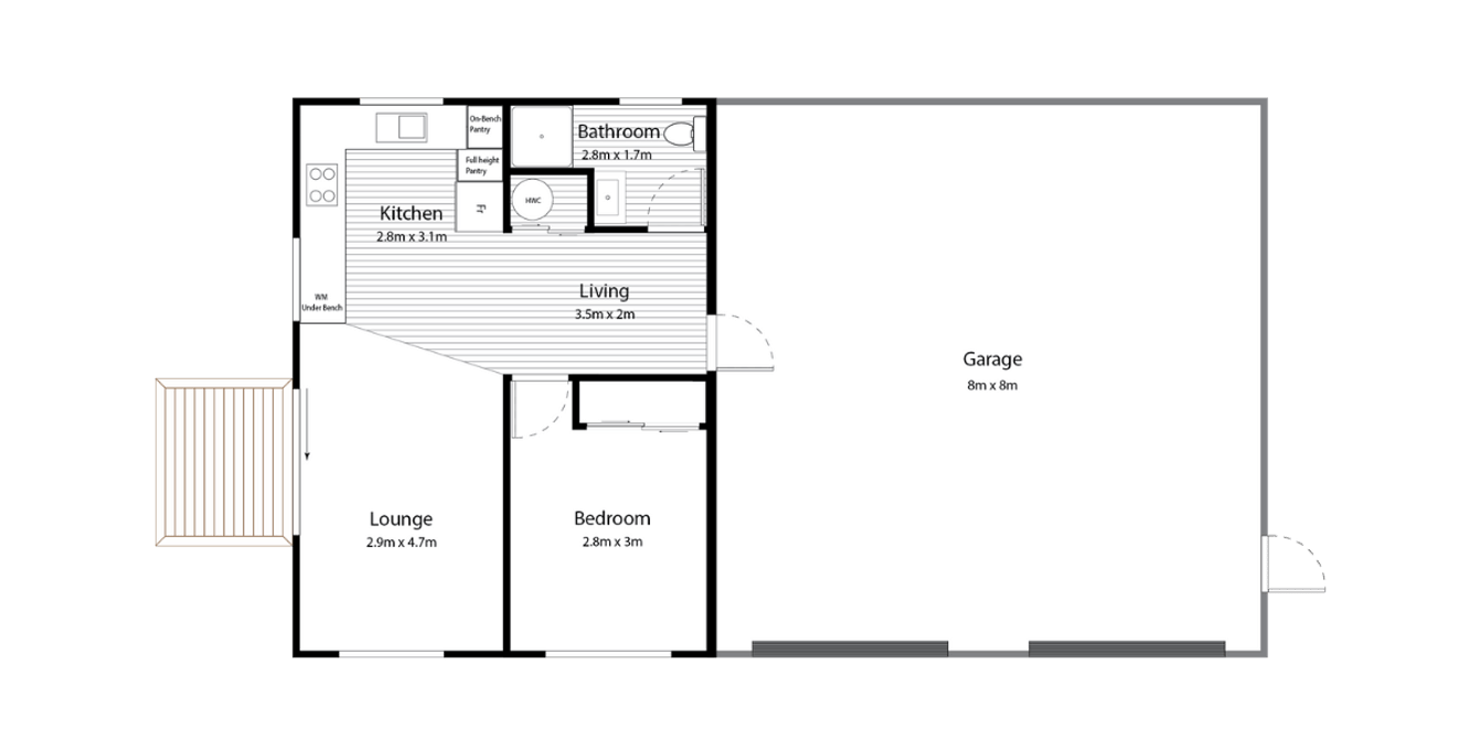 The Ohau features a 32m2 living area, 1 double bedroom, a lounge area, a full bathroom, and a signature 32m2 garage.